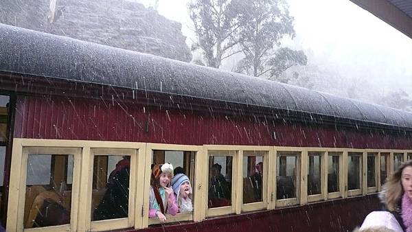火車開動,拉著氣笛,車上所有的小孩都興奮地喊著「Chu Chu」,車廂內的廣播也在解說這段鐵路的歷史。不過這時候幾乎所有人都朝著窗外看,沒錯,下雪了,而且雪越飄越多。加上地勢的關係,風本來就很大,看起來很有大風雪的架勢。